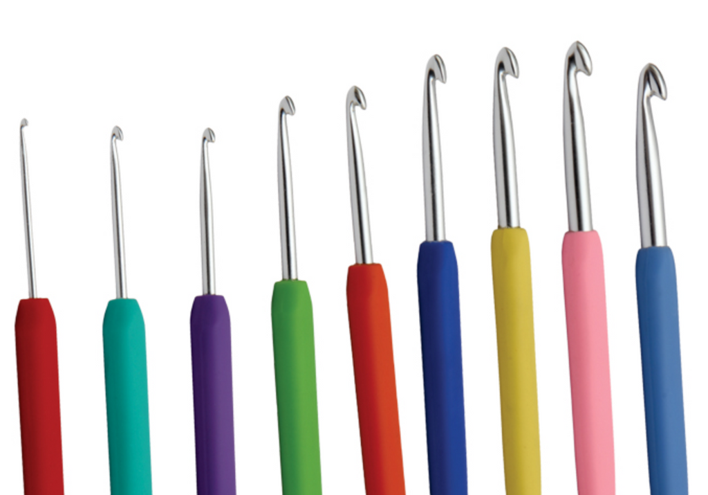 - Single ended aluminium crochet hooks with sturdy yet soft grips